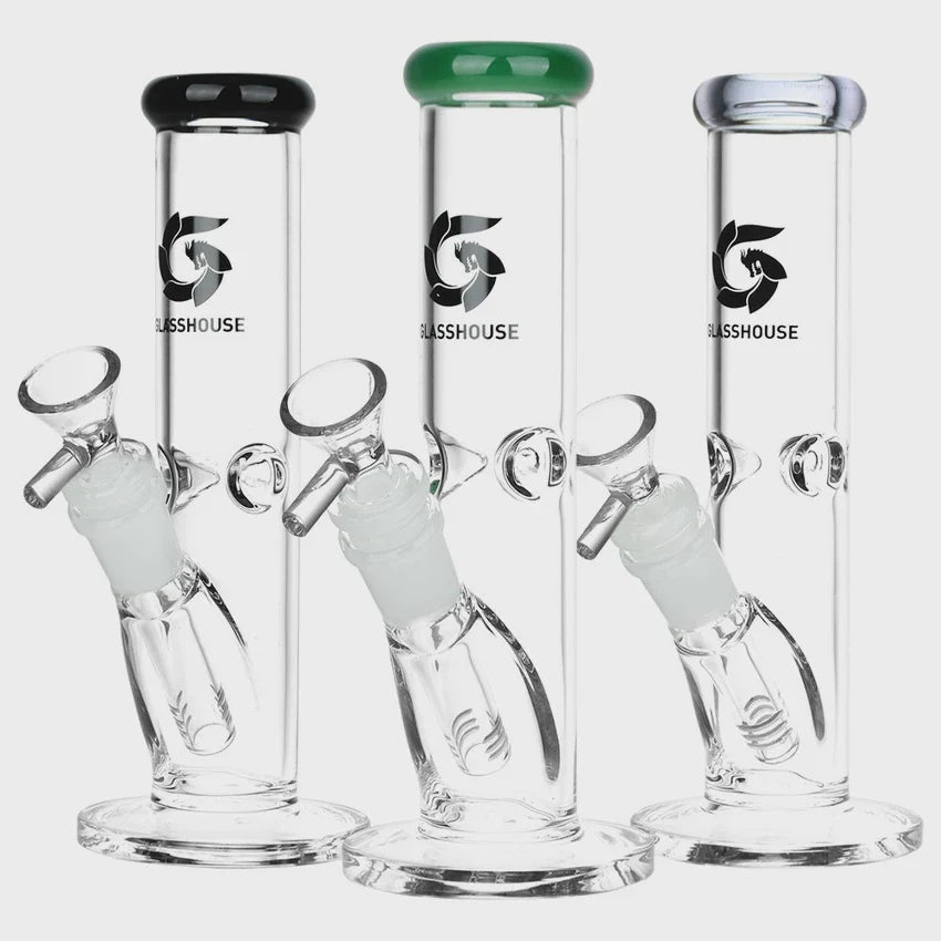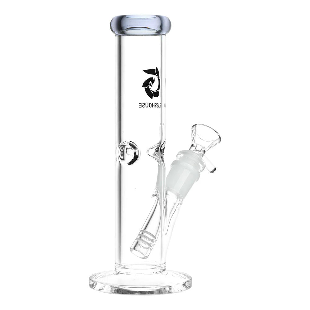 La pipa de agua de vidrio de tubo recto de Glass House cuenta con un cuerpo recto con difusor de tubo descendente ranurado y un embudo para hierbas con asa.